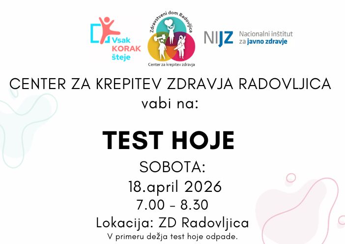 Občinski test hoje na 2 km13.04.2026Center za krepitev zdravja ZD Radovljica vabi na občinski test hoje na 2 km, ki bo v soboto, 18. 4. 2026, od 7 - 8.30 ure Lokacija: ZD Radovljica Test hoje je enostaven in varen test, na katerem si s pomočjo tako hitre hoje kot jo zmorete, da pri tem ne ogrožate svojega zdravja, ... -