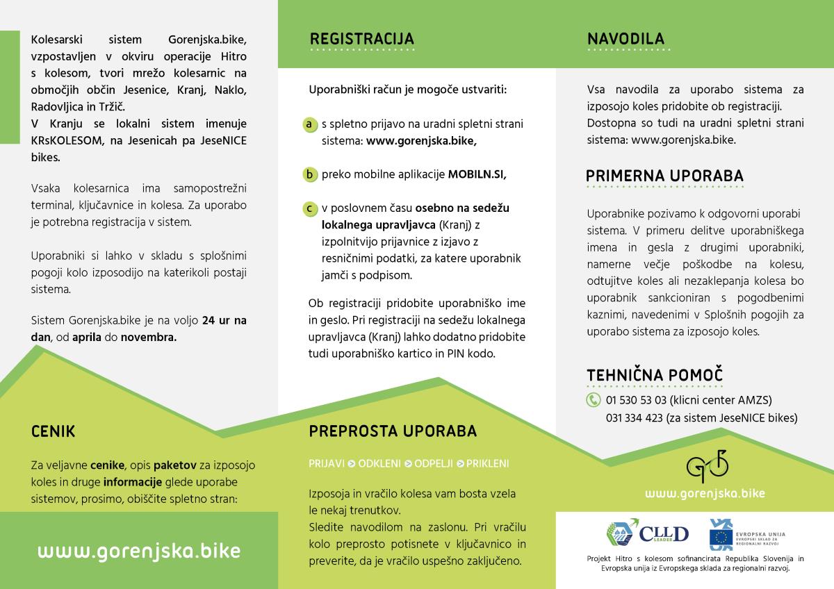 Gorenjska.bike je kot enoten sistem izposoje koles vzpostavljen še v štirih gorenjskih občinah: na Jesenicah, v Naklem, Tržiču in Kranju. Vsaka kolesarnica ima samopostrežni terminal, ključavnice in kolesa. Za uporabo je potrebna registracija v sistem. Uporabniki si kolo lahko izposodijo na katerikoli postaji sistema Gorenjska.bike. V mestni občini Kranj je nameščenih 28 postaj, v občini Jesenice 6, v občini Tržič 3, v občin Naklo pa 1. Skupaj je na razpolago 245 koles, od tega jih je nekaj več kot polovica s pomožnim električnim pogonom.