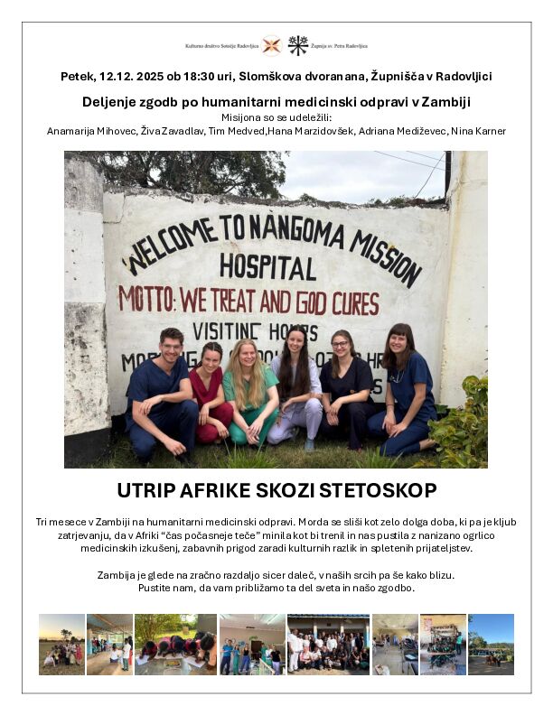 UTRIP AFRIKE SKOZI STETOSKOP08.12.2025Petek, 12.12. 2025 ob 18:30 uri, Slomškova dvoranana, Župnišča v Radovljici Deljenje zgodb po humanitarni medicinski odpravi v Zambiji Misijona so se udeležili: Anamarija Mihovec, Živa Zavadlav, Tim Medved,Hana Marzidovšek, Adriana Mediževec, Nina Karner