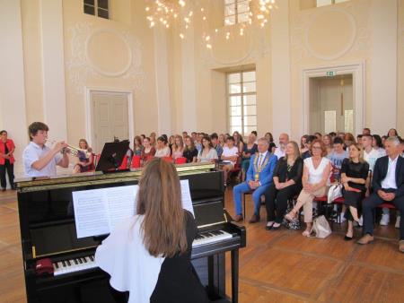 Župan Ciril Globočnik jim je skupaj z ravnatelji in razredniki danes čestital na sprejemu v Baročni dvorani Radovljiške graščine. Učencem je izročil priznanja ter knjižna darila, podelitev pa so z odličnimi glasbenimi nastopi spremljali učenci Glasbene šole Radovljica violinist Klemen Poklukar, harmonikar Jure Krč in trobentač Jakob Arih.