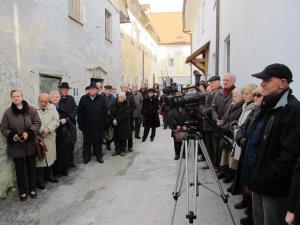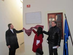 Župan Ciril Globočnik, veleposlanik Jernej Videtič, v.d. vodje Sektorja za človekove pravice na Ministrstvu za zunanje zadeve, in predstavnica veleposlanika države Izrael Maja Kutin so danes odkrili spominsko ploščo na rojstni hiši radovljiškega pravnika in pedagoga Uroša Žuna na Linhartovem trgu 14.