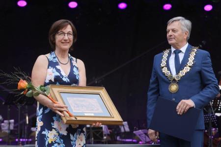 Najvišje občinsko priznanje – veliko plaketo – je letos prejela zdravnica Eva Pogačar za svoje delovanje v gorski reševalni službi, civilni zaščiti in Rdečem križu. V imenu nagrajencev se je zahvalila, ker je bil pomen njihovih dejanj prepoznan. Poudarila je, da k uspešni družbi lahko prispeva vsak in zato ni treba biti strokovnjak ali bogataš. S pravim posluhom vsakdo lahko obogati celo skupnost in v Radovljici je veliko takšnih, ki so pustili tudi slovenske sledi.