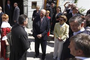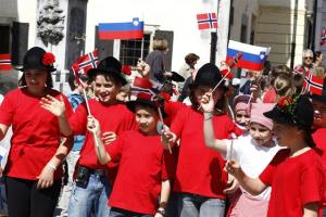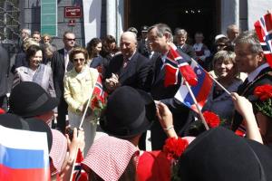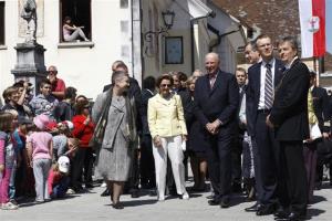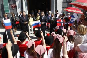 Norveški kralj Harald V. in kraljica Sonia ter predsednik države Danilo Türk in soproga Barbara Miklič Türk so bili danes dopoldne v Radovljici deležni prisrčnega sprejema. S številnimi Radovljičani so jih na Linhartovem trgu pričakali tudi učenci OŠ A. T. Linharta Radovljica.