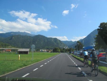 Na nedavno prenovljenem vozišču lokalne ceste na odseku "Elan - Begunje", na južnem delu Begunj, so bili označeni pomožni kolesarski pasovi ter izvedena optična zožitev vozišča.